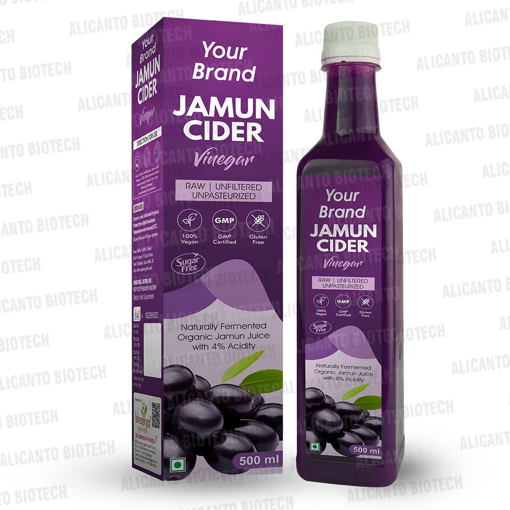 Alicanto Biotech is a leading Jamun Cider Vinegar manufacturer, offering pure, natural and high-quality vinegar made from fresh Jamun fruit. Our GMP & ISO-certified facility ensures premium production with rich nutrients and health benefits. We provide private labeling, bulk supply and customized packaging to meet business needs. Partner with us for affordable, reliable and top-grade Jamun Cider Vinegar Juice manufacturing.