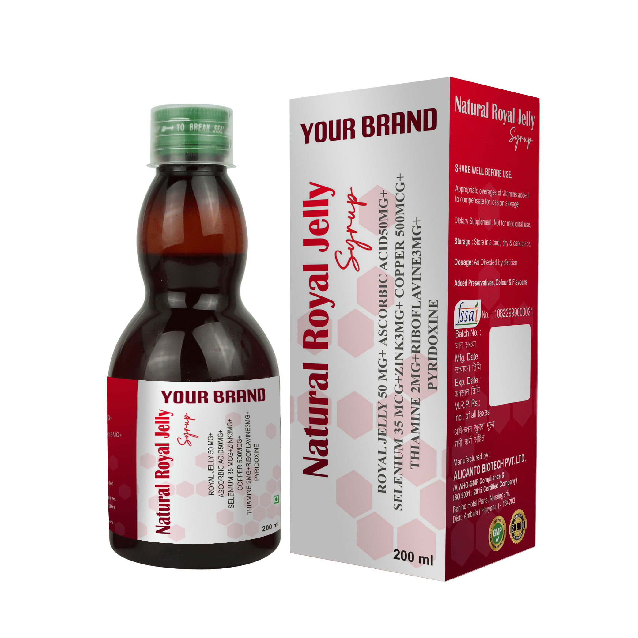 Alicanto Biotech is a reputed Ayurvedic & Herbal Pharma company in India, specialized in manufacturing pure, natural and high quality Royal Jelly Syrup. This syrup is prepared from royal jelly produced by bees, which is rich in healthy nutrients and helps in immunity boosting, increasing energy, skin health and hormone balancing. Alicanto Biotech does not use any harmful chemicals, artificial flavours or colours in manufacturing its syrup, thereby maintaining its natural potency. Our company manufactures with state-of-the-art technology in GMP, ISO and AYUSH certified facility and also provides third party manufacturing services across India. If you want to have Natural Royal Jelly Syrup produced for your brand, Alicanto Biotech is the best choice for you.